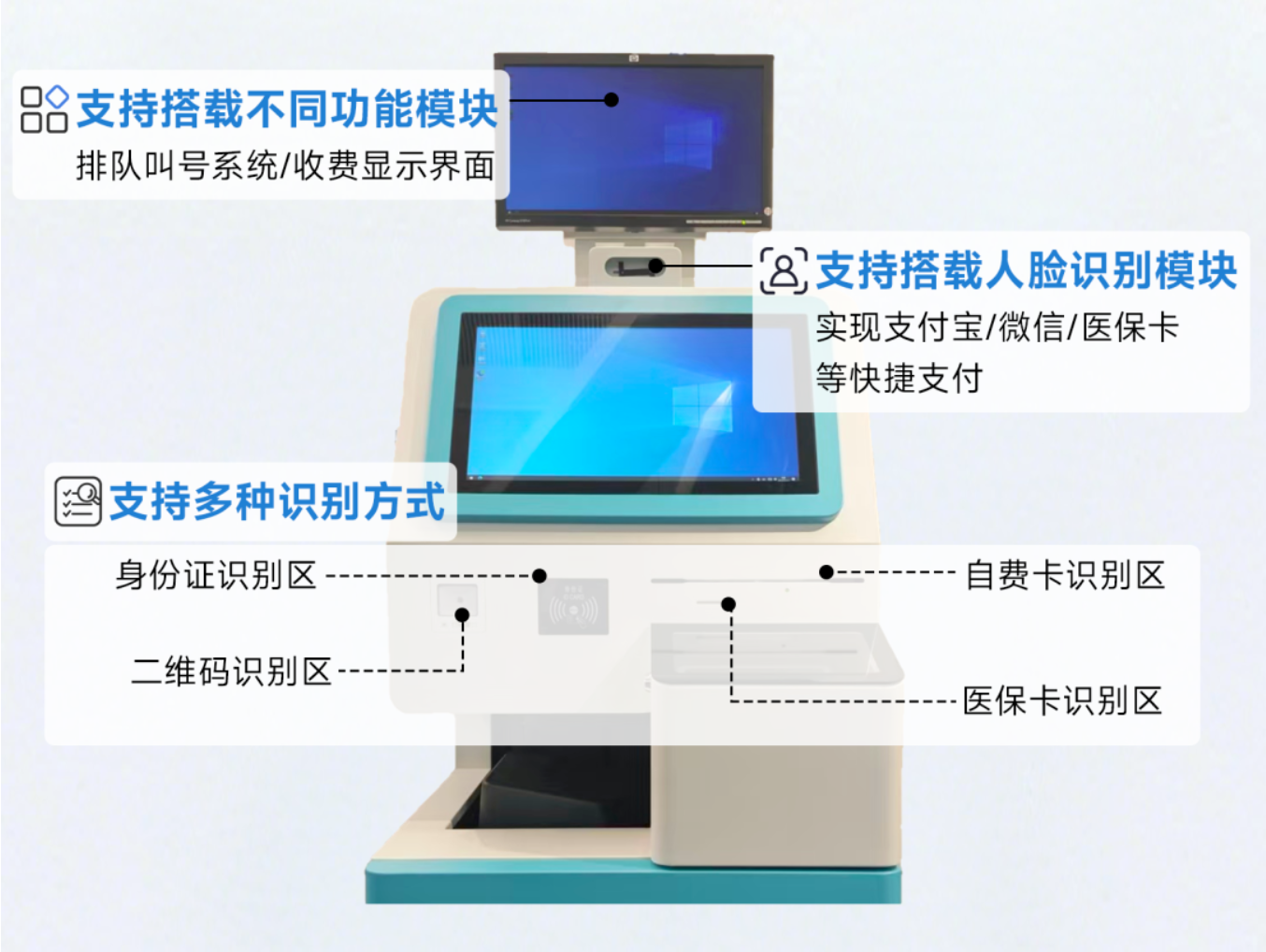 为充分满足医疗机构的多元化应用需求,该医疗自助打印方案配备的自助终端还支持搭载拓展屏显示、人脸识别摄像头模组等各类模块化选配件,同时支持身份证、二维码、自费卡、医保卡等多种识别方式,可助力医院打造更高效便捷的智能服务窗口。