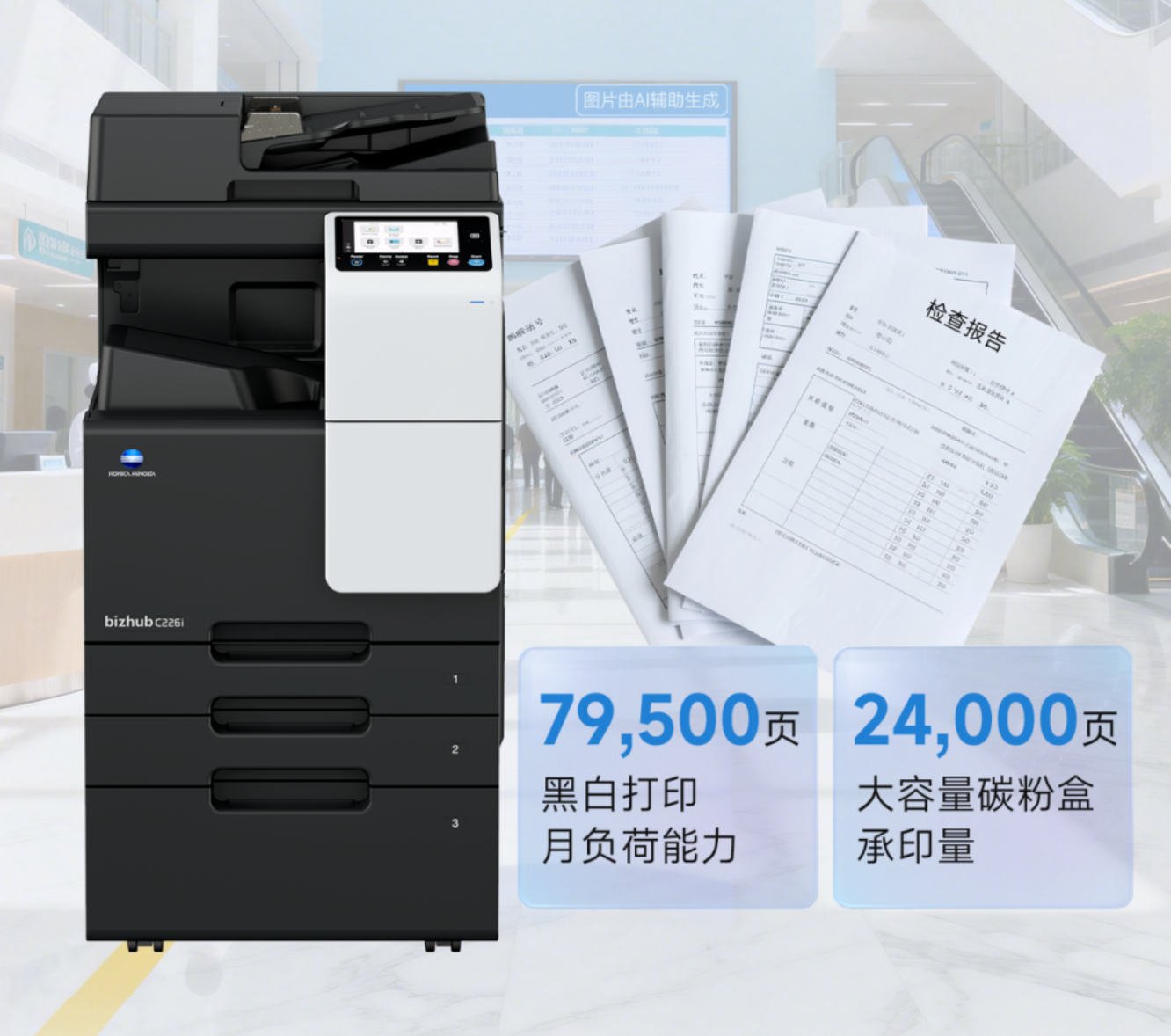 该医疗自助打印方案可广泛兼容柯尼卡美能达多款主流数码复合机,灵活适配各级医院实际应用场景。针对过往打印设备负荷过高、故障频发的核心痛点,方案所配置的柯尼卡美能达A3彩色数码复合机bizhub C226i(以下简称“bizhub C226i”)具备强大的耐用性:月负荷能力高达79,500页(黑白),并标配超大容量碳粉盒(约24,000页),能从容应对峰值打印需求,大幅延长耗材更换周期,从而显著降低医院运维成本。