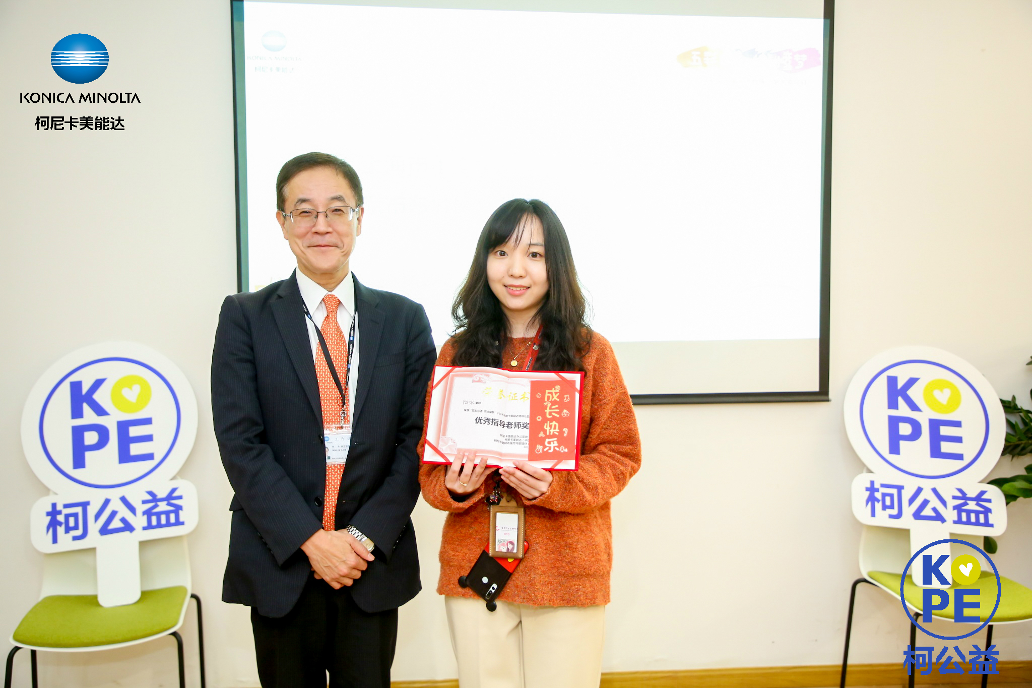 柯尼卡美能达办公系统(中国)有限公司董事长炭谷忠彦(左一)为一等奖作品指导老师颁奖