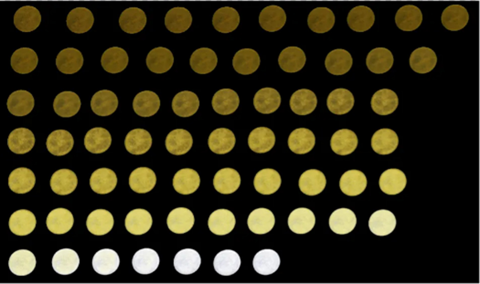 每幅图像首先根据暗场和白场参考进行归一化处理。随后,将实验过程中采集的全部67幅图像合并为一个文件,形成拼接图像。该图像展现了棉片在不同干燥阶段的状态,从右上角开始时非常湿润,到右下角时已完全干燥。拼接图像按行从左到右、从上到下排列。