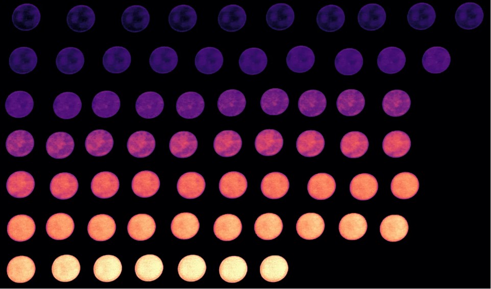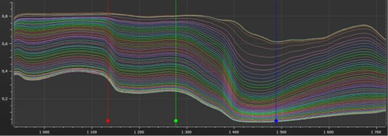 FX17高光谱相机对样品的干燥过程进行了监测,并每隔4分钟进行一次测量,直至样品完全干燥。整个过程共进行了67次测量,耗时264分钟。而后我们使用SpecimINSIGHT软件对数据进行了分析。
