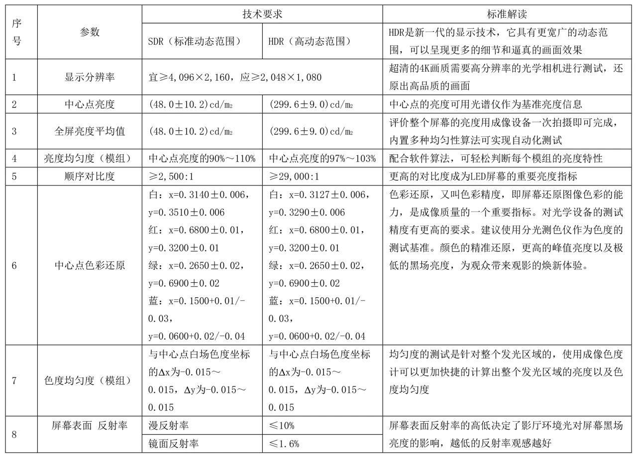 我们截取了DY/T 3—2020《数字电影巨幕影厅技术要求和测量方法》中部分测试标准,与新的LED影院标准进行了对比:
