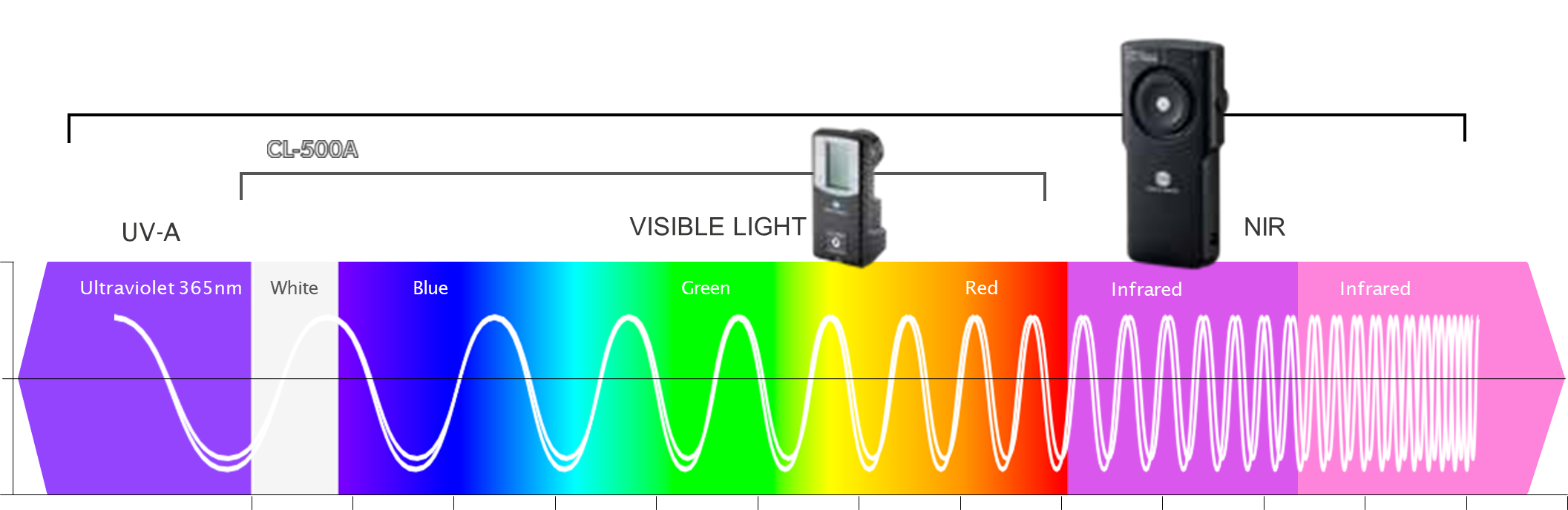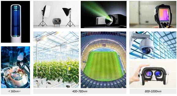 1 – 近红外与可见光测量范围 CL-700A 提供从可见光到近红外的宽波段光谱测量能力(360nm-1000nm) 主要应用:LED 芯片、显示屏、 照明、投影仪、图像传感器、智能手机摄像头、AR/VR 穿戴设备、安防系统等。 |