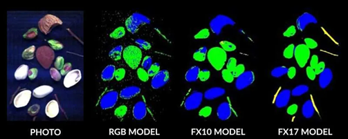 除了能捕捉到近红外(NIR)区域的光谱信息,Specim FX10高光谱相机测量数百个波段所呈现的彩色图像,其准确性远超RGB相机三个波段构成的图像(图2)。那些能够覆盖可见光谱范围以外的高光谱相机,比如Specim FX17,其检测范围涵盖了900-1700nm的近红外区域。这些相机提供了扩展的光谱数据,有助于构建性能更稳定的分析模型(具体取决于实际应用需求)。如图2所示,Specim FX17相机是分离杏仁、开心果与果壳及异物的良好仪器——其性能优于基于RGB的模型。值得注意的是,其他应用场景可能需要测量范围在短波红外(SWIR,1700–2500nm)、中波红外(MWIR,2.7–5.3 μm)或者长波红外(LWIR,8–12 μm)的高光谱相机。