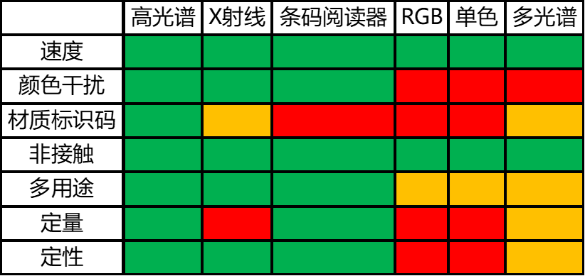 机器视觉系统通常整合多种互补的传感器。下表重点展示了高光谱技术相较于其他常用传感器的优势。