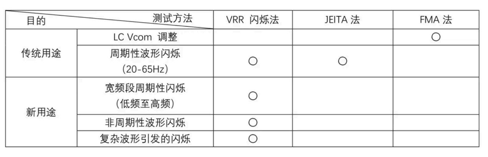 在可变刷新率(VRR)显示屏中,需重点评估两类特殊闪烁现象:第一,刷新率切换瞬间产生的临时性非周期性闪烁,其次,显示屏刷新具有复杂特性、以长时间离散间隔出现的非规律性闪烁。传统闪烁测量主要采用对比度(FMA)法和专为LCD设计的JEITA标准方法,但这些方法无法准确测量VRR技术带来的新型闪烁问题。