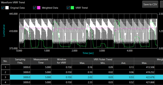VRR闪烁趋势:VRR闪烁值随时间的变化。这反映了人眼感知到的闪烁度,有助于显示屏制造商根据用户体验,评估被测显示屏的图像质量。