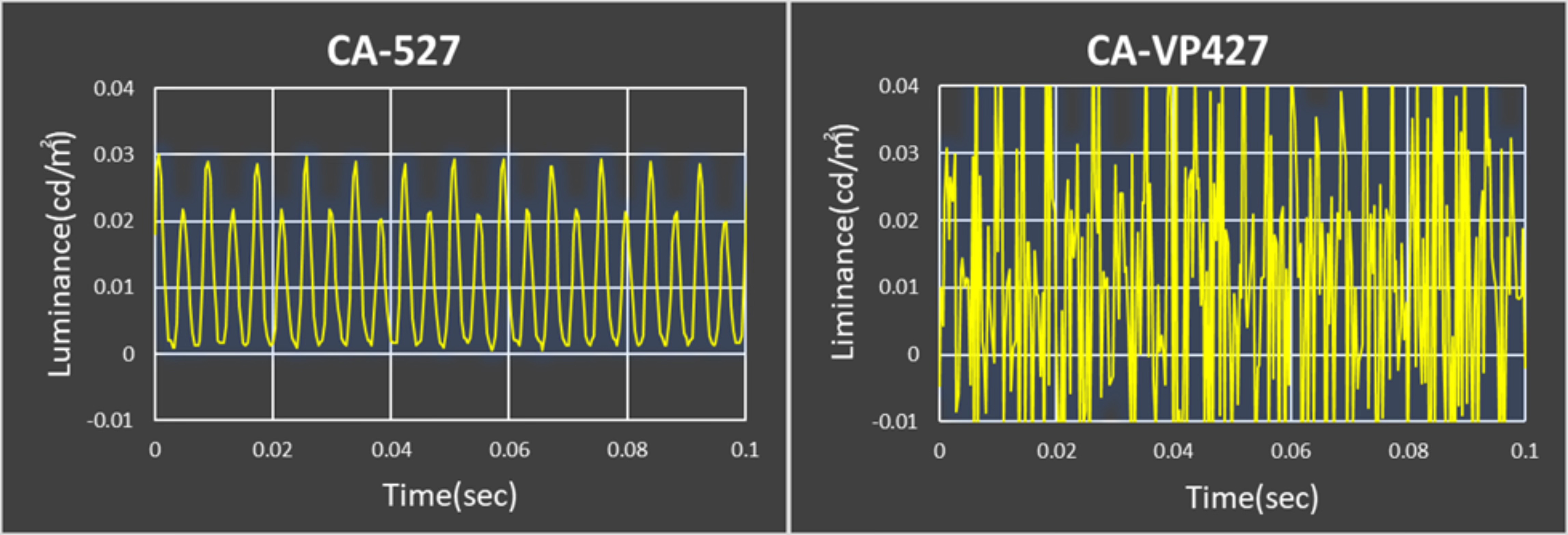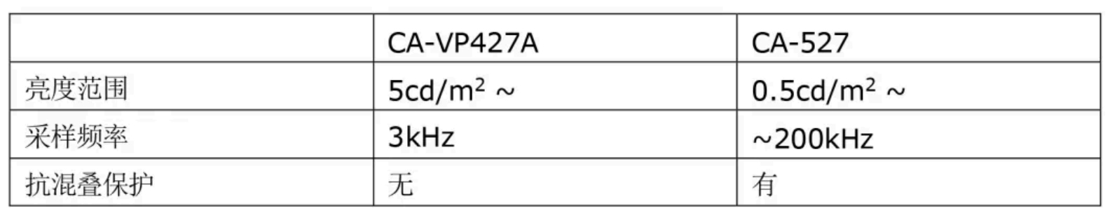 CA-527:在低亮度显示测量方面表现优异,凭借其功能特性(如下表所列),能够高质量地测量发光波形和闪烁。它特别适用于OLED测量,因为OLED的发光波形变化剧烈,而CA-527消除了混叠伪影的担忧。