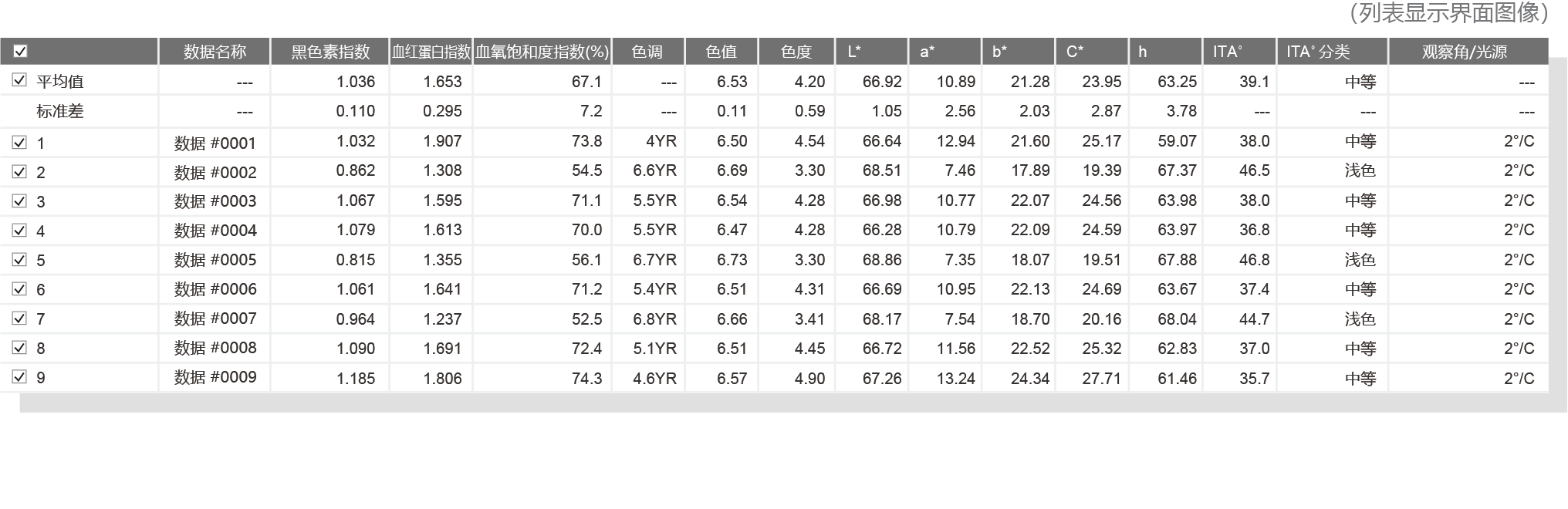 | 图形显示 | 色调-色值图、血红蛋白指数-黑色素指数图、 ITA° 图表、二维用户指定坐标轴图表 (*4) |