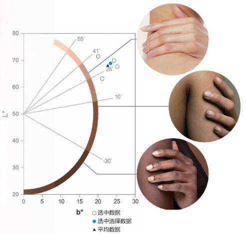 可显示用于评估肤色和颜色的ITA°(个体类型角)图表。测量数据会绘制在图表上,让您能够一目了然地轻松识别其所属的组别。